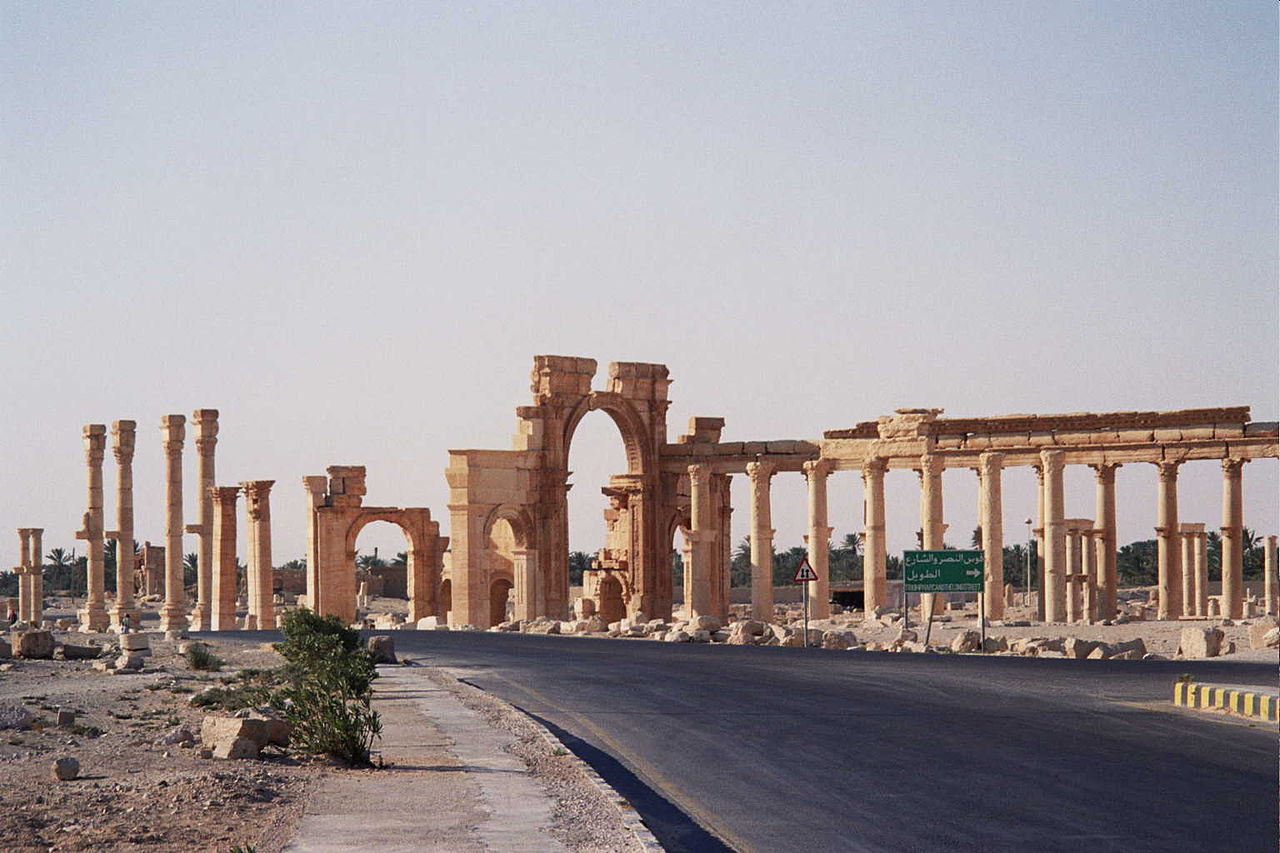يقف القوس النصبي، المعروف إعلامياً باسم «قوس النصر»، عند منتصف الشارع المُعَمَّد ليعلن انتقال الزائر من حيّ المعابد إلى حيّ السوق. بُني نحو سنة 200 م، ويتكوّن من دعامتين جانبيتين يضمهما قوس نصف دائري يزيّنه إفريز من عناقيد عنب وزخارف حربية. مثّلت البوابة الإطار الاحتفالي لانتصارات تدمُر على طرق القوافل، وأُعيد استعمالها في العصر البيزنطي بإضافة صليب داخل حلية التاج الكورنثي.