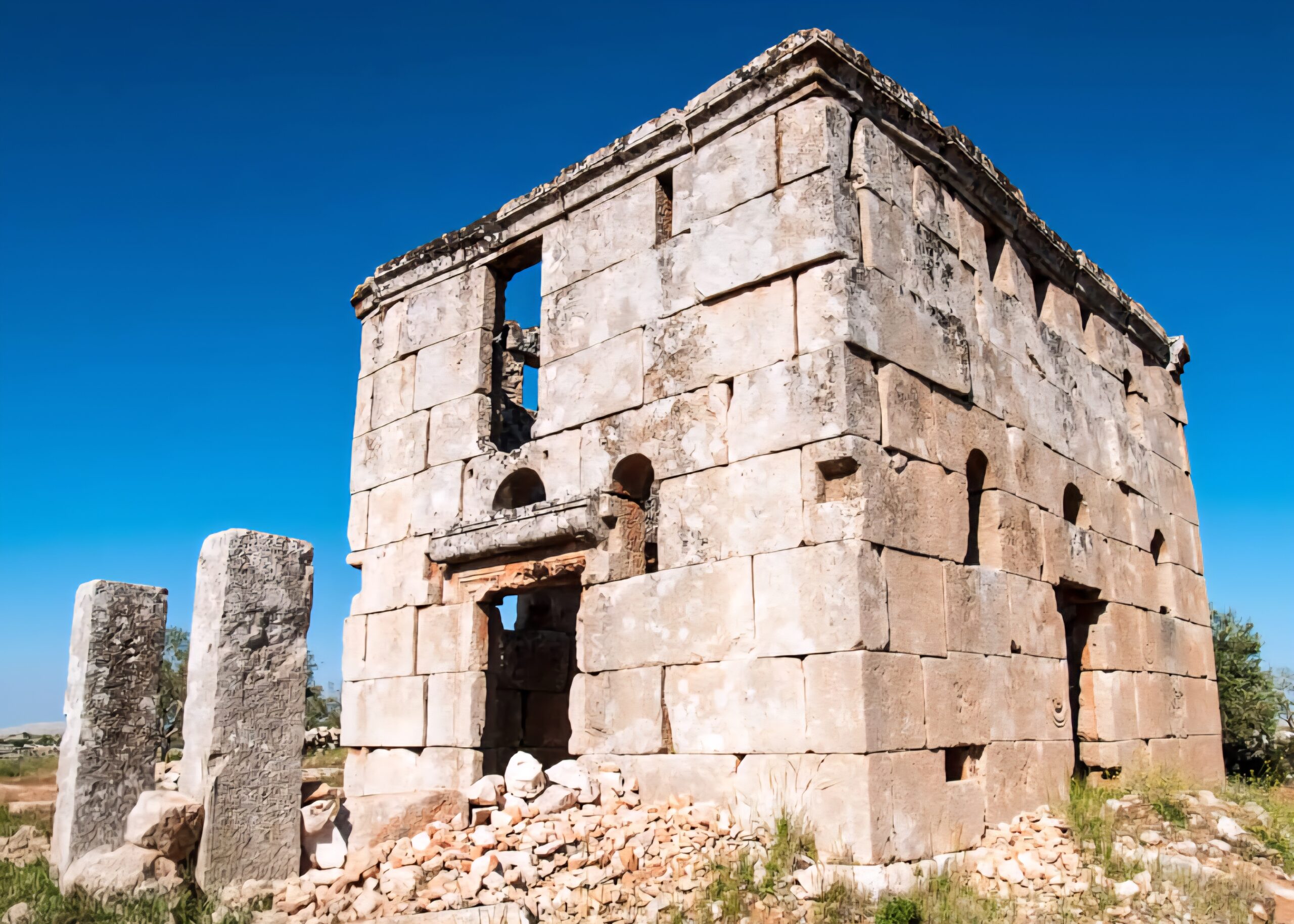 يقف معبد كفر دريان شامخاً على مصطبة صخرية في جبال إدلب، وهو المثال الوحيد في المنطقة على الطراز المعماري المعروف بـ”بيريبتر” أو الأعمدة المحيطية. بُني المعبد حوالي عام 150 ميلادية، وكان مخصصاً لعبادة “زيوس بوموس” وفقاً لنقش يوناني محفوظ في متحف حلب.