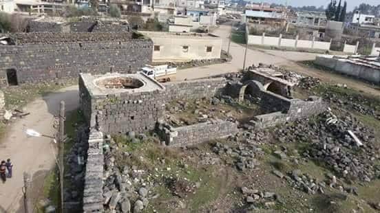 تُعد من أبرز الحمامات الرومانية في سوريا، بنيت من الحجر البازلتي وتتألف من عدة قاعات أكبرها مثمنة الشكل. تظهر أحواض الاستحمام وقنوات التدفئة المصنوعة من الآجر بوضوح فيها.